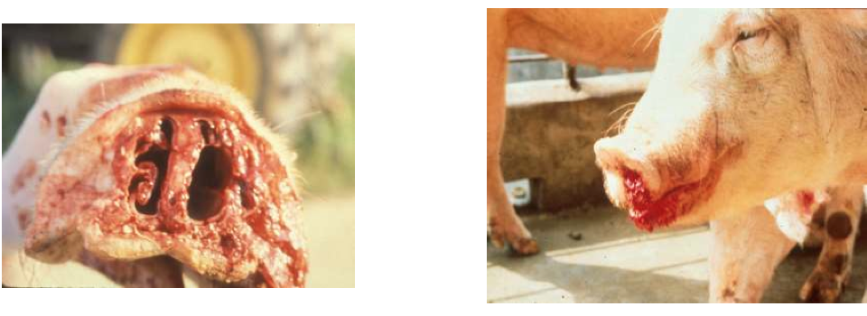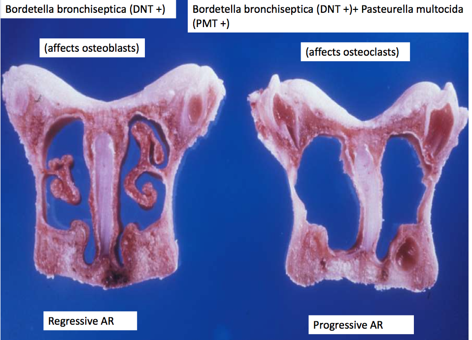 Chronic progressive rhinitis throughout growing period with nasal turbinate atropy and varying degrees of facial deformity