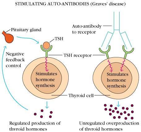 –> TSH receptor autoantibodies (TRAb) (continuous stimulation of TSH receptor)