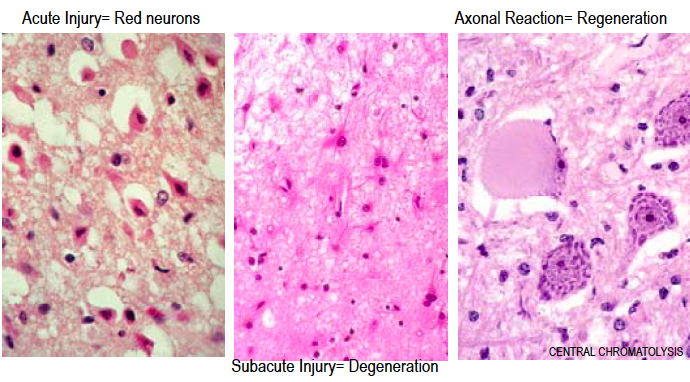 Red neurons (cytoplasmic eosinophilia) -cell death -loss of Nissl substance -nuclear pyknosis