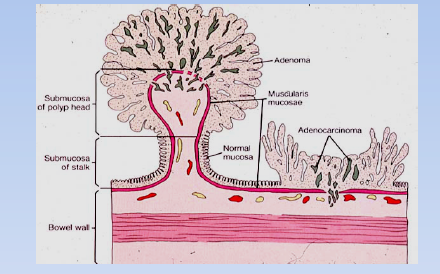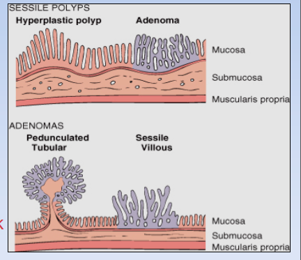 larger and more ominous than tubular adenoma rectum and rectosigmoid sessile finger like extension all degrees of dysplasia carcinoma will directly invade the bowel wall