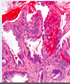 **•Grossly:** * Cholangiocarcinoma usually occurs in non-cirrhotic liver, which distinguishes it from HCC * HCC usually occurs in a cirrhotic liver except in the case of HBV, which has oncoproteins that can integrate into the human host and can induce HCC without cirrhosis * The etiology of HCC is usually related to cirrhosis * The tumor is composed of a tree-like tumorous mass and is firm; it has a gritty, tumor surface **•Histology:** * This is a type of adenocarcinoma with a marked desmoplastic reaction * Demoplasia is a fibroblastic reaction to tumor invasion * Early, you can identify lymphatic and vascular invasion * This is rarely bile stained because it does not produce bile