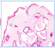 •focal nodular hyperplasia If you section one piece of tissue and look at it histologically for microscopic evaluation, what do you see? * Top left: well-circumscribed lesion * Top right: a central scar composed of fibrous tissue à by definition, a scar is fibrotic tissue that replaces normal parenchyma * In the middle, there are some thicker-walled blood vessels * This is a vein or artery à it is a thicker-walled vessel * Bottom left: on the edge of focal nodular hyperplasia, you see some inflammation and bile duct proliferation * Bottom right: if you do a special stain, you can highlight the fibrous tissue