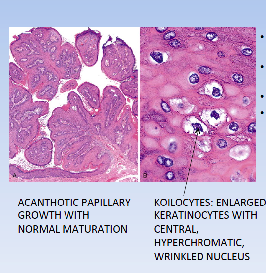 enlarged keratinocytes w central hyperchromatic wrinkled nucleus