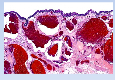 * This hemangioma was resected * This is typical of a hemangioma à there is very hemorrhagic, sponge-like tissue * The tissue shows a lot of vasculature filled with blood * Bottom: the vasculature becomes large, sclerotic and fills with blood * Macroscopic: * These are usually solitary lesions, but there may be multiple lesions * Typically these are less than 3 cm in size, but can become very large à these are called giant hemangiomas * Microscopic: * Virtually all consist of vascular spaces * These are mostly venous-type