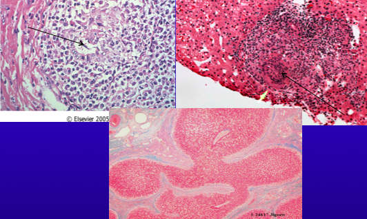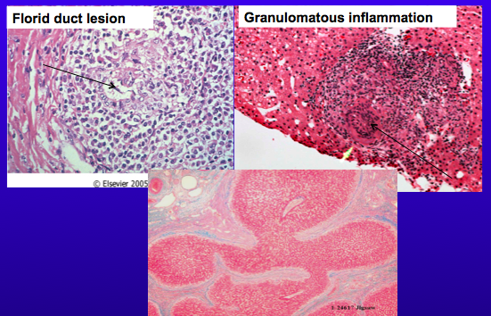 • Histology of PBC: the pt has high antimitochondrial antibodies. He has a granulomatous inflammation [top right image – black arrow points to the granuloma]. You have a destruction of the bile duct – the bile duct is no longer intact in the top left image [black arrow].