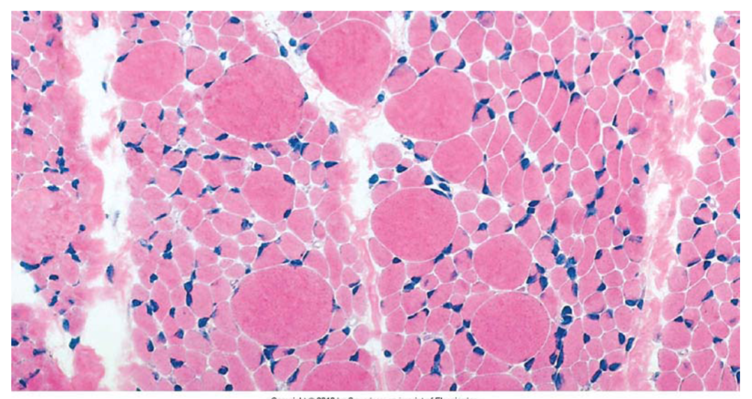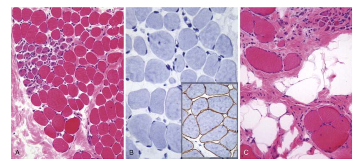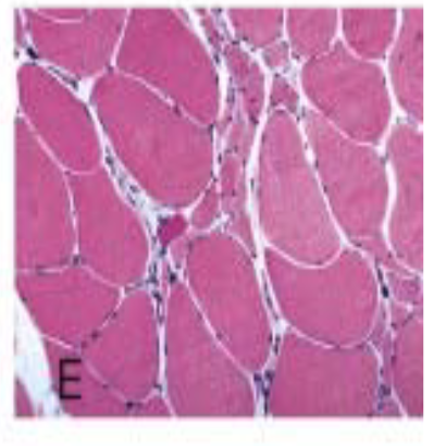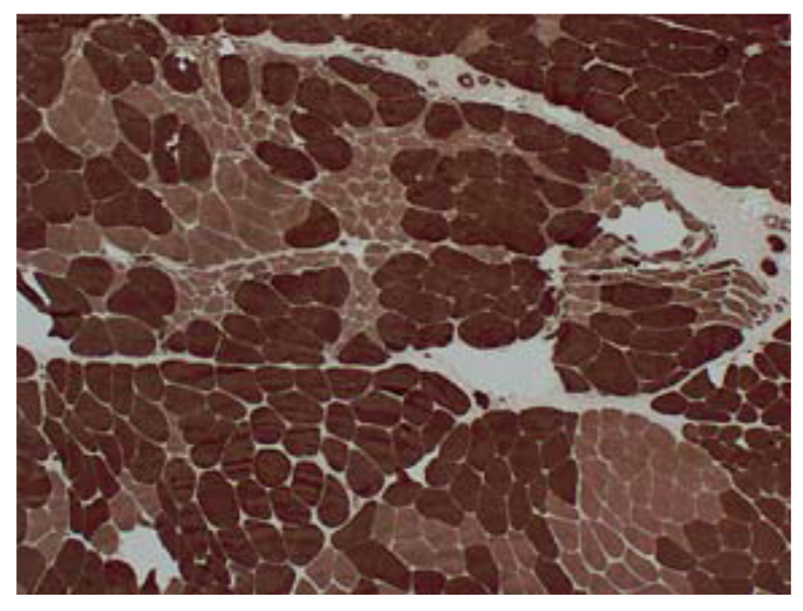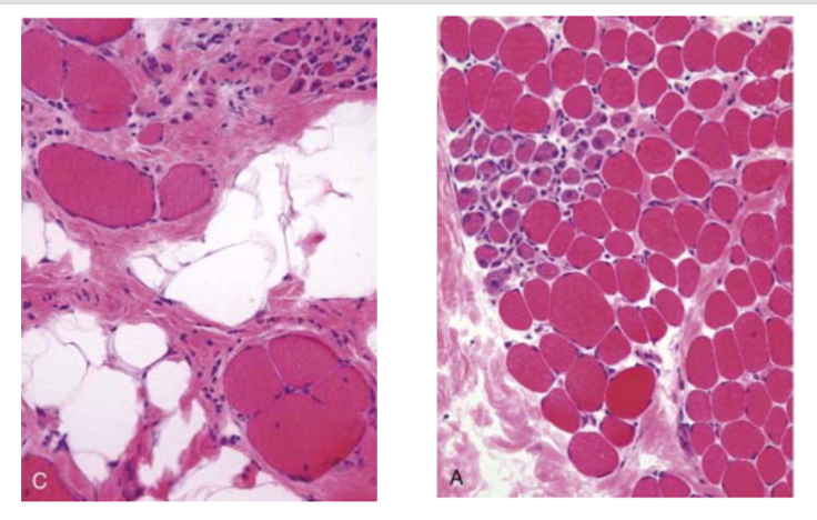 In the sample on the right, even more myofibers have been replaced by collagen & adipose