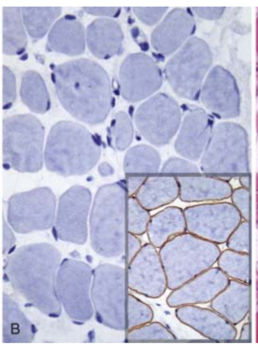 the brown outline of the myofibers in the right-hand box is the dystrophin; notice this is absent in the larger image, indicative of the absence of dystrphin