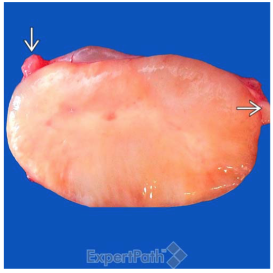 ovoid or fusiformmass with gelatinous or wavy cut surface