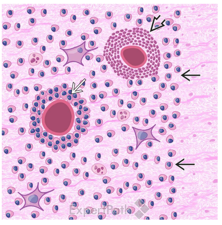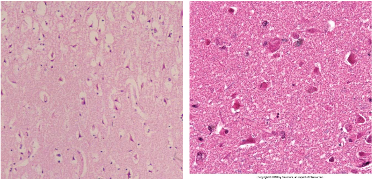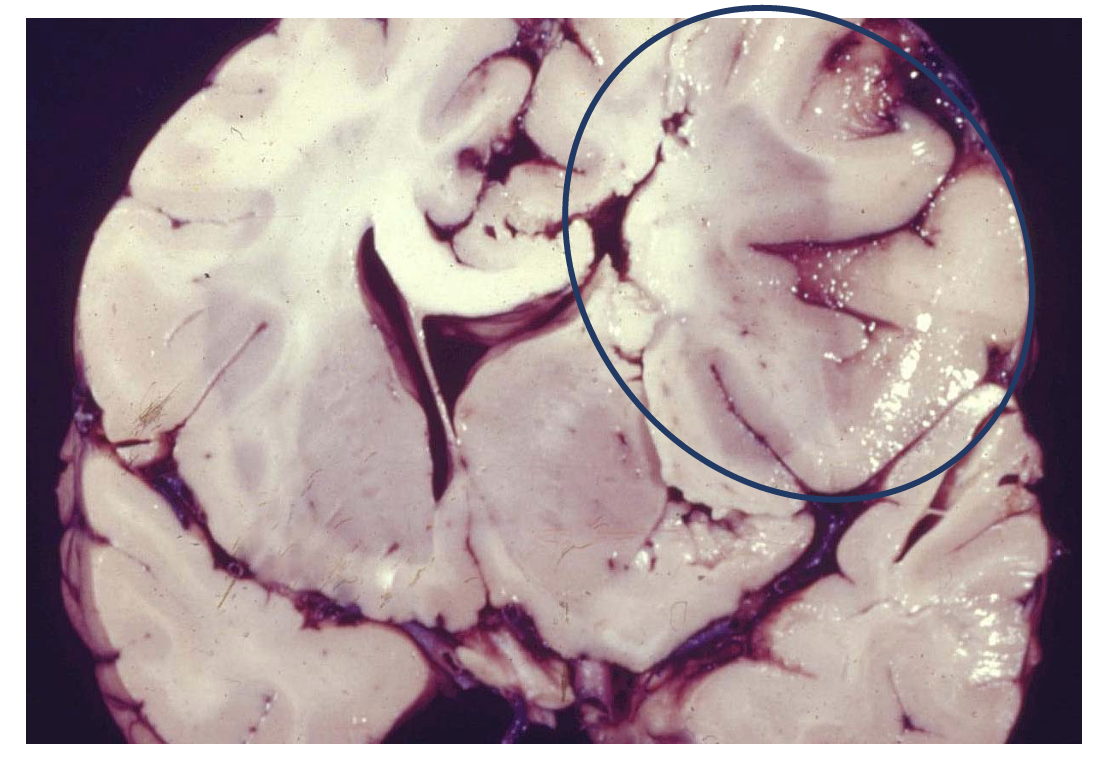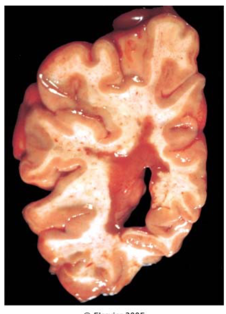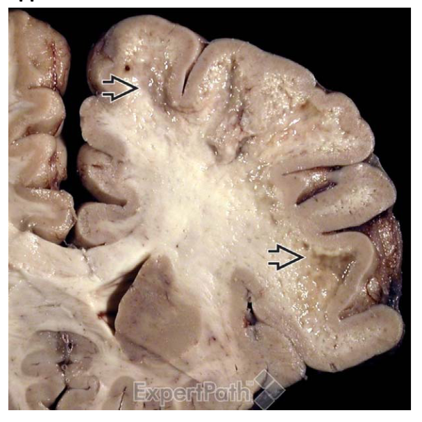 large areas of cerebral white matter have depressed, cavitated areas w/ granular appearance (black open arrow)
