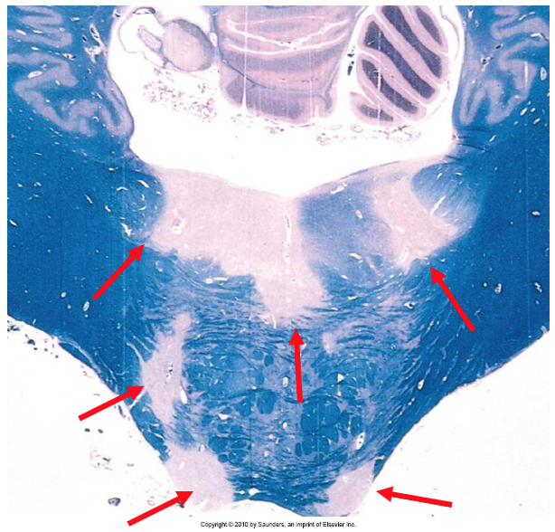loss of myelin w/ relative preservation of axons & neuronal cell bodies