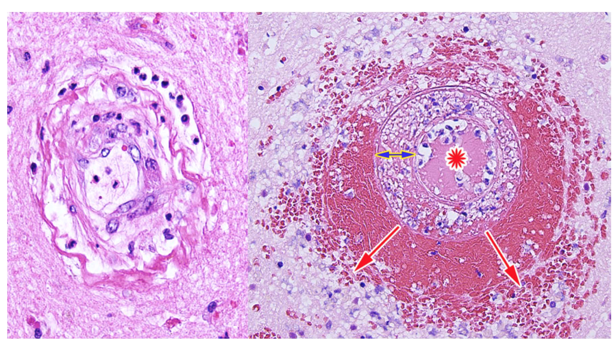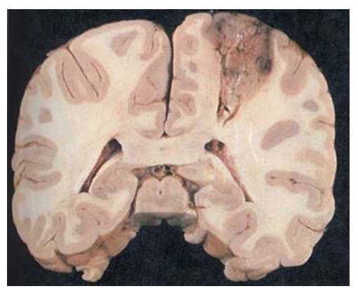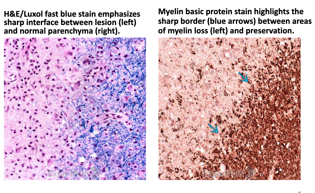 sharp interface between lesion- demyelination - (left) and normal parenchyma (right)