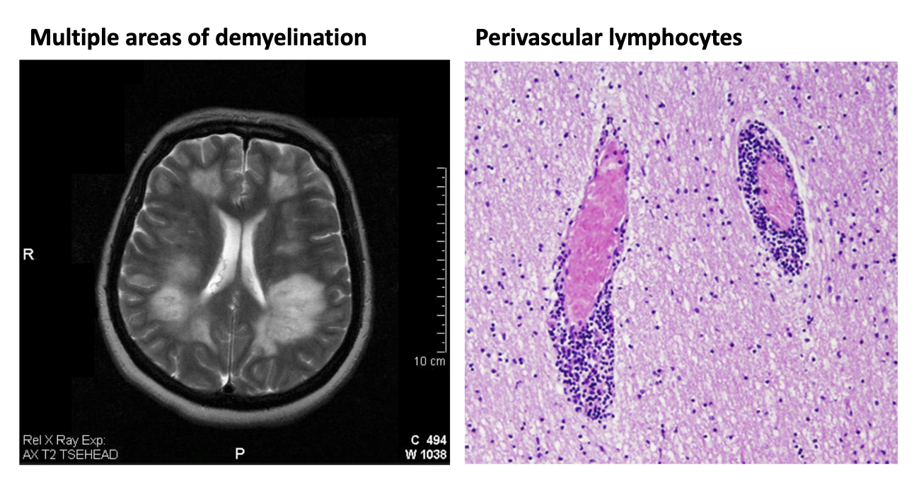 causes demyelination & variable axonal loss ; multiple lesions (plaques) involving brain & spinal cord