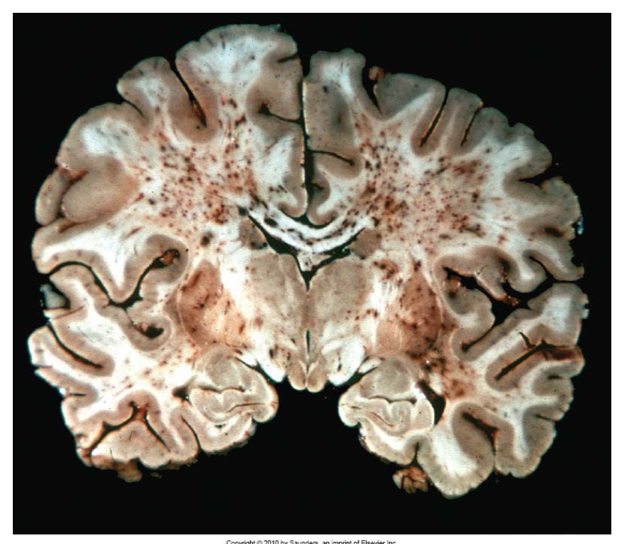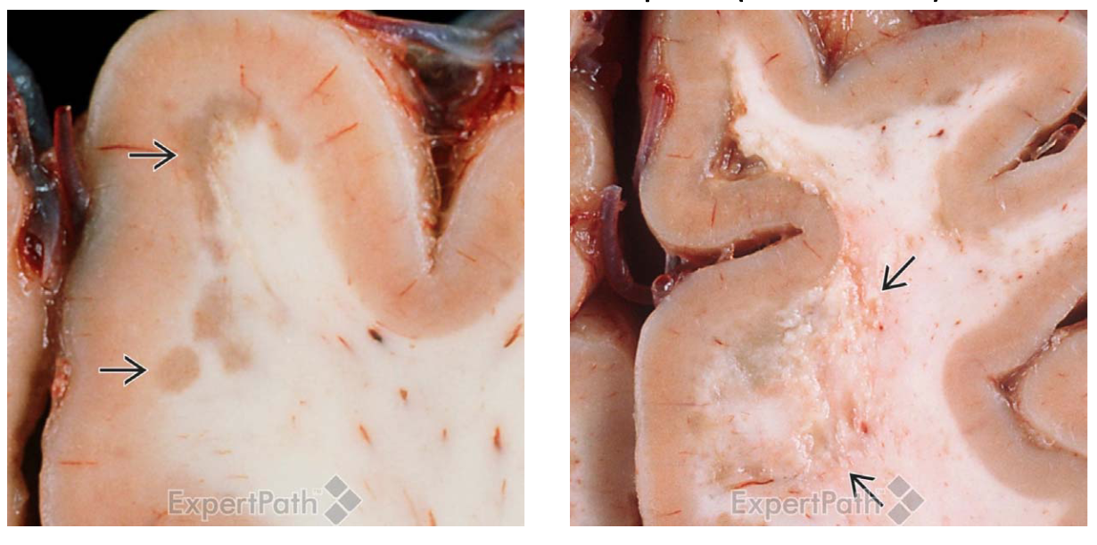 wel circumscribed, tan, irregularly shaped plaque in periventricular white matter (demyelinating)