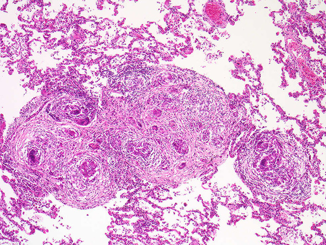 Central of non-caseating granuloma: epitheloid macrophages surrounded by rim of mononuclear cells. Multinucleated giant cells also seen at higher mag.