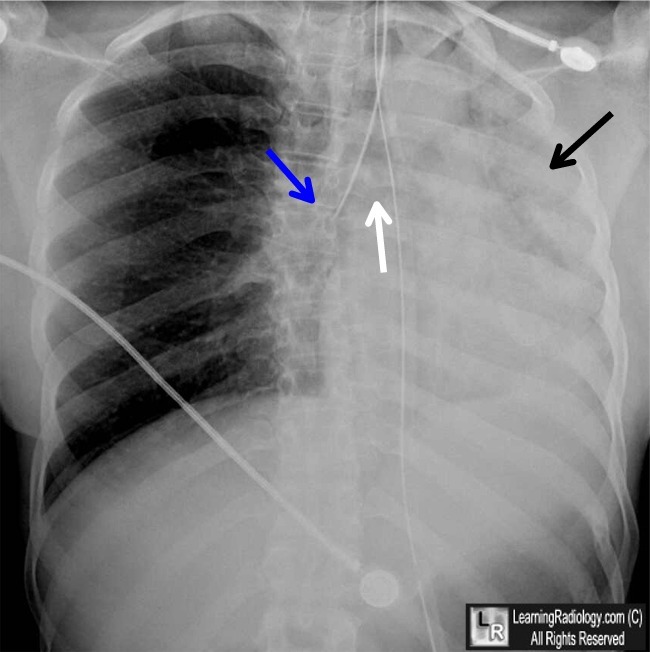 A patient is brought into ER after a major car accident. EMTs intubated and stablized patient. Dr. on staff orders a CXR. Explain the imaging. Also, what simple examination could be done to have accessed issue w/o CXR?