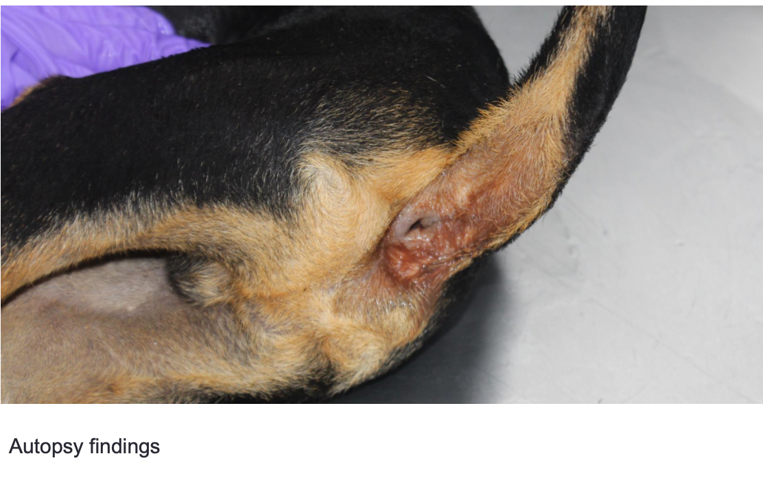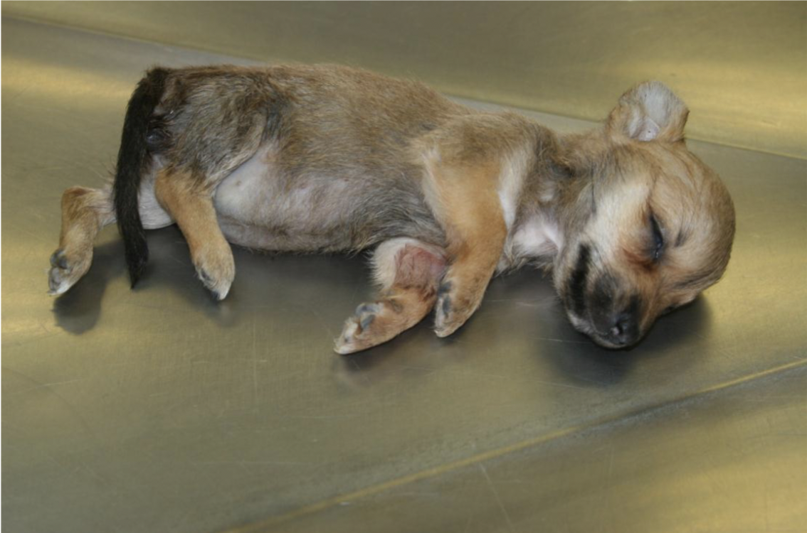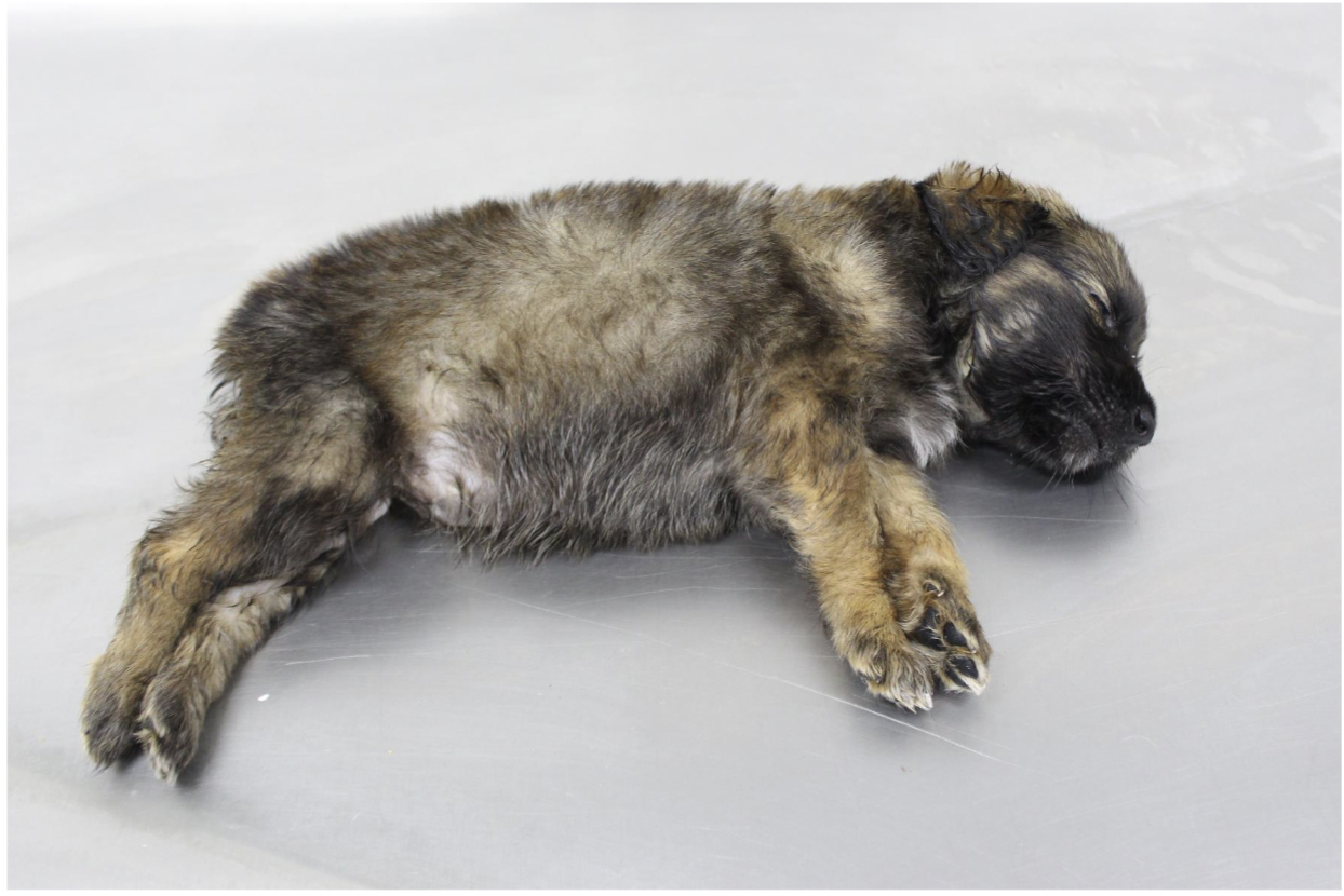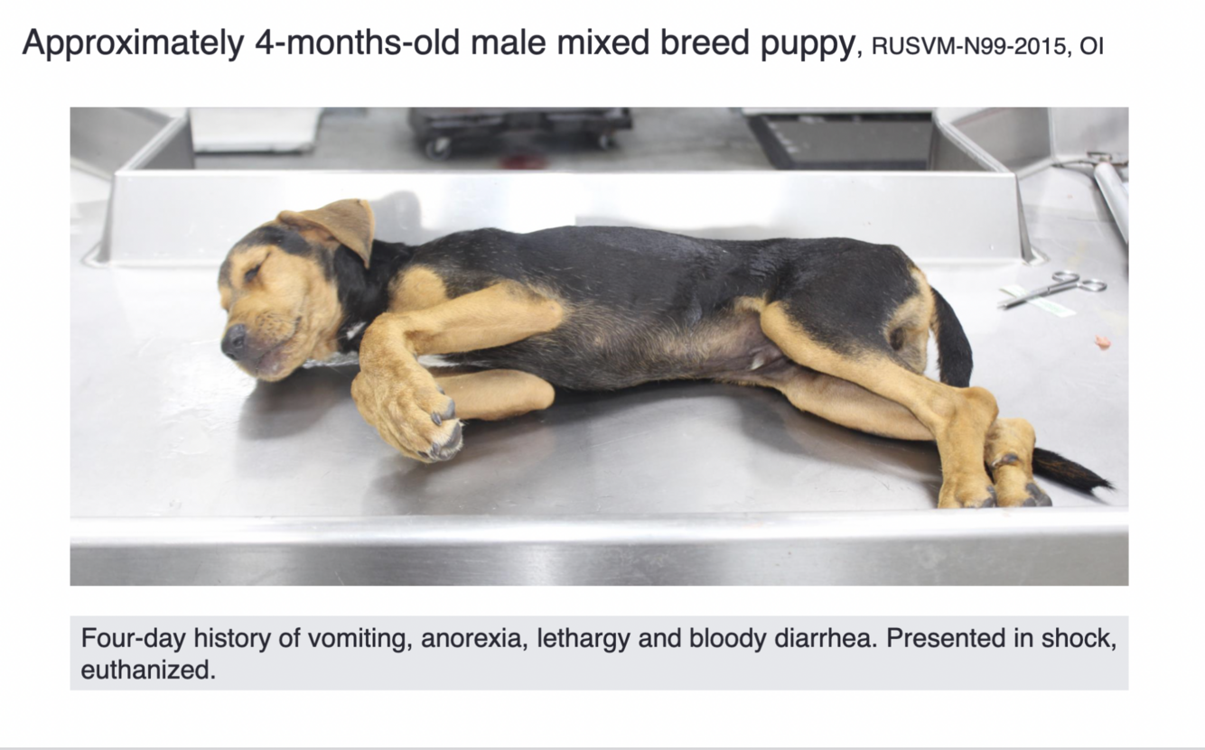 Edematous; fluid in peritoneal cavity; Subcutis looks gelatinous; could also be hypoproteinemia; subcu fluids were administered to this puppy, so that could be the reason for why it looks “wet”