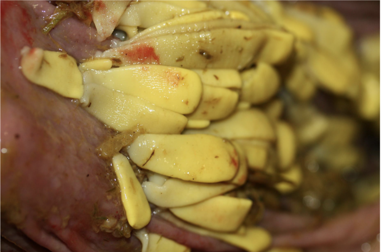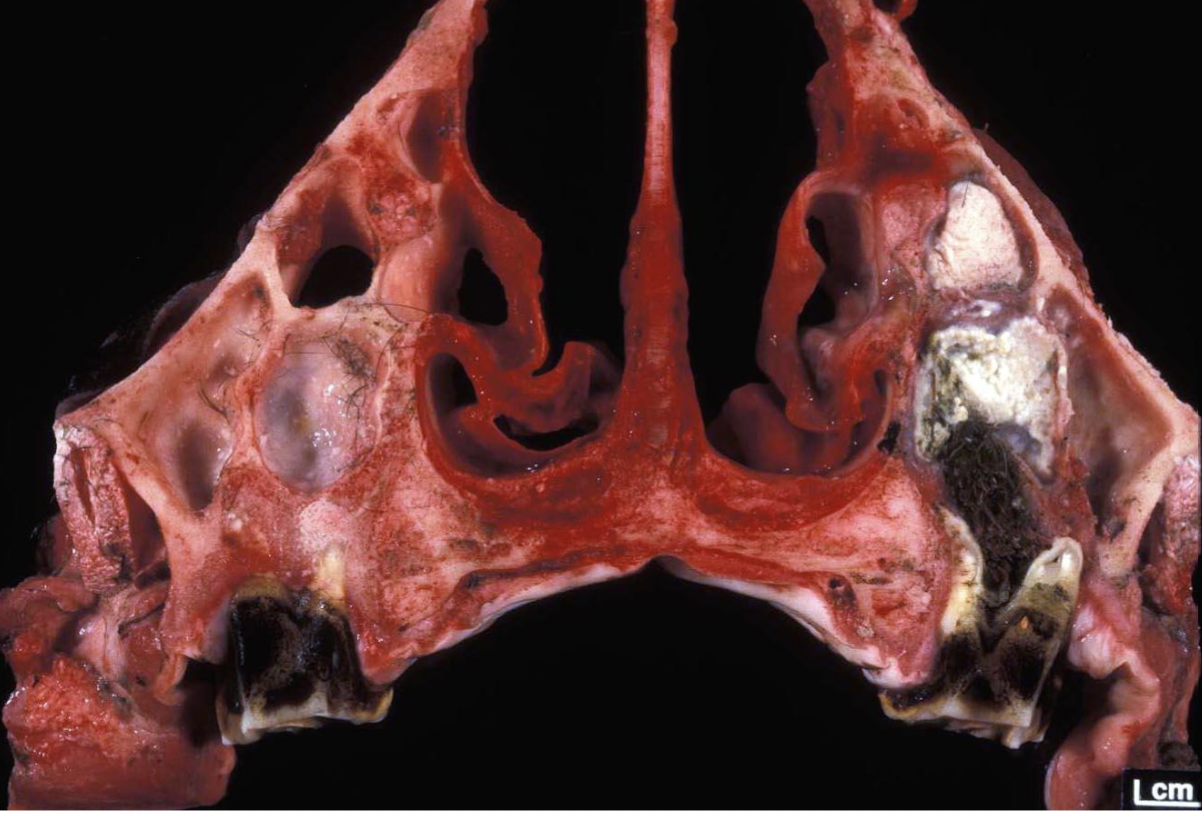 Right side: impacted feed (e.g. hay) at the root of the tooth, caseous, suppurative exudate (neutrophils present) in the sinuses –> chronic suppurative necrotizing sinusitis. This is a tooth root abscess –> destroys bone (tooth infection can lead to sinusitis).