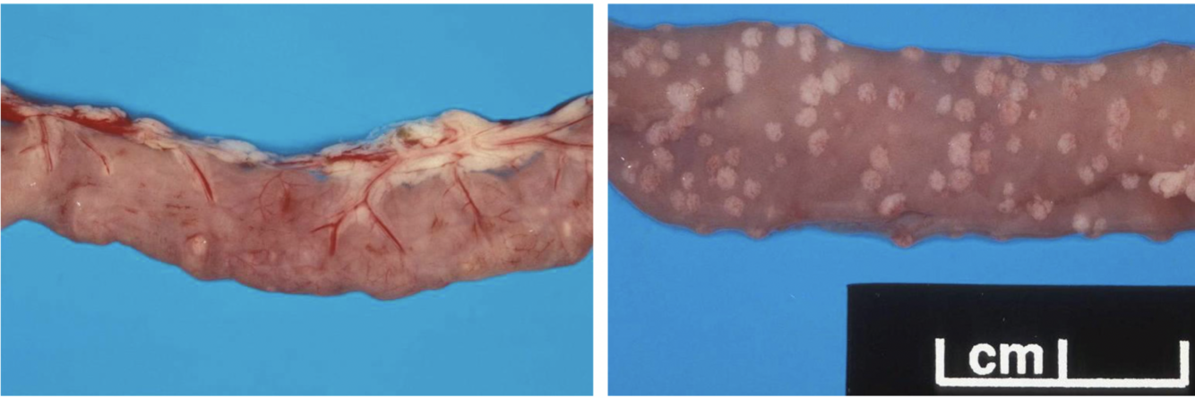 Coccidial infections in intestine usually produce these multifocal lesions. Areas where you have infestation of the epithelial cells of the intestine by the coccidial organisms –> significant proliferation as a compensatory measure.