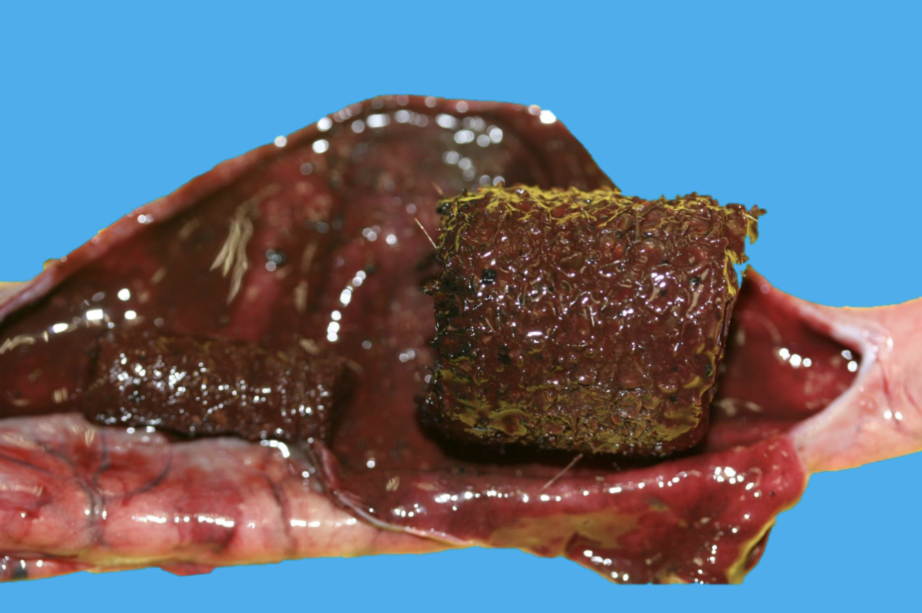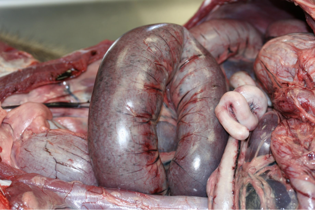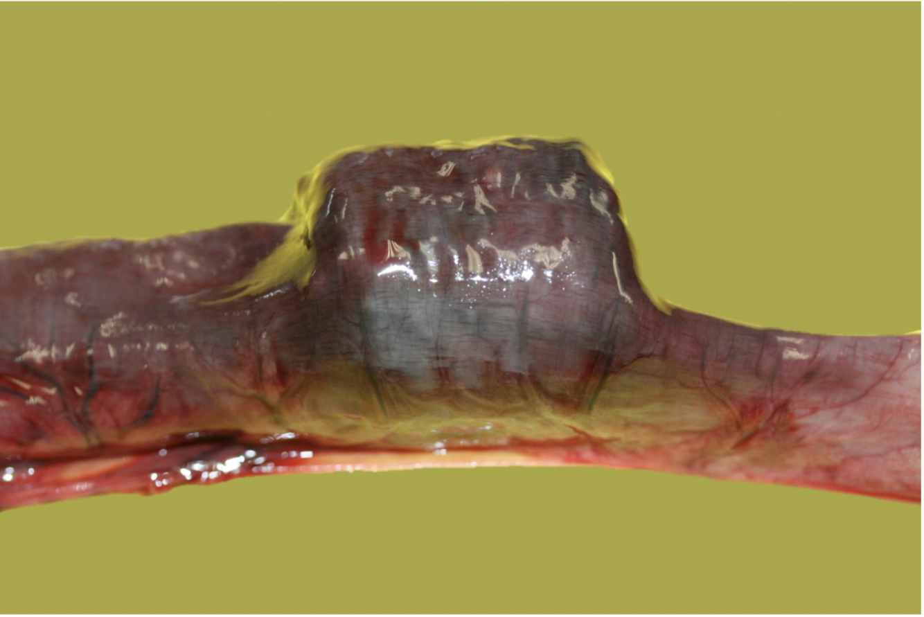 Piece of the ileum; relatively common condition in horses. The terminal ileum looks different (circle on left). The mucosa is much smaller –> intestinal stenosis (narrowing). The wall of the intestine looks hypertrophic (thickening) in both the internal and outer layer.