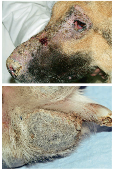 Pinnae/Ear: diffuse erythematous alopecic papules with crusts and mild yelow-brown exudate