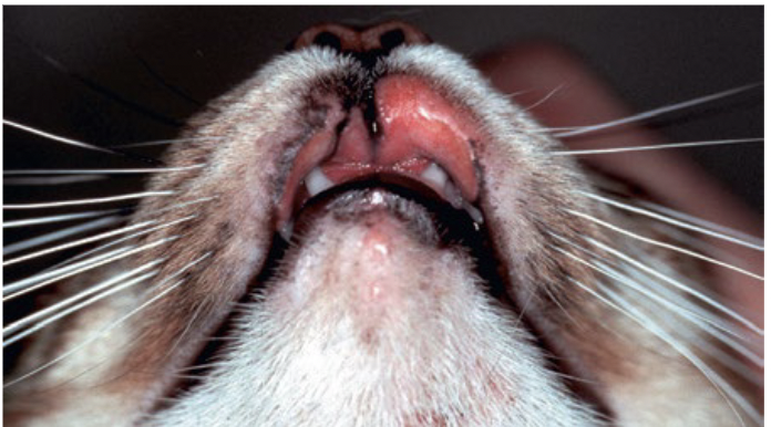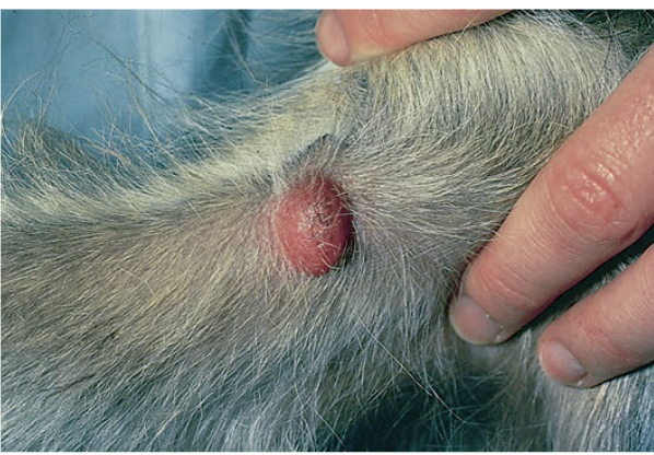 Erythematous papules in the inguinal region, pinnae, and paw pads. The lesion on the palmar aspect of the paw is diffuse erythematous, alopecic.