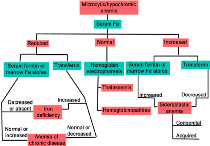 This is a microcytic, hypochromic anemia. Iron deficiency anemia presents as microcytic, hypochromic anemia, and transferrin will be high, ferritin will be low, serum iron will be low and % saturation will be low. Thalassemia also presents as microcytic, hypochromic anemia, but has less variation in size (lower RDW) than iron-deficiency anemia. Anemia of chronic disease also presents as microcytic, hypochromic anemia, but will have increased ferritin, decreased TIBC, decrease serum iron and decreased % saturation. Lead poisoning also presents as a microcytic, hypochromic anemia.