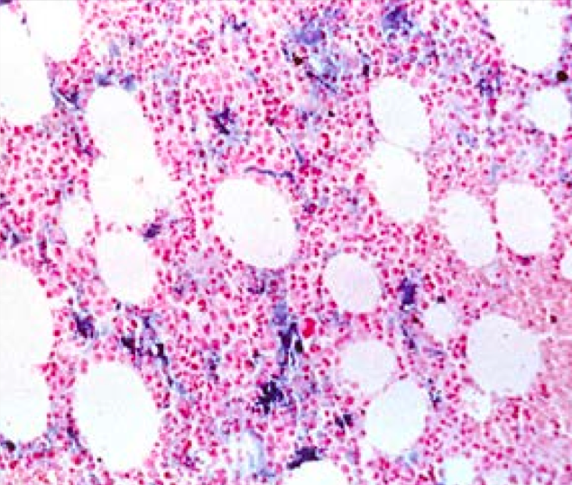 A normal biopsy will appear like the image below when stained with Prussian blue, showing that Fe is present in the marrow.