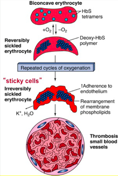 Inflammation causes expression of adhesion molecules on the surface of RBCs. This causes really sticky cells that are irreversibly sickled. These go on to cause thrombosis of small blood vessels.