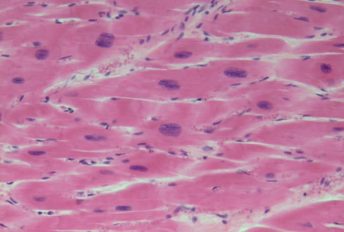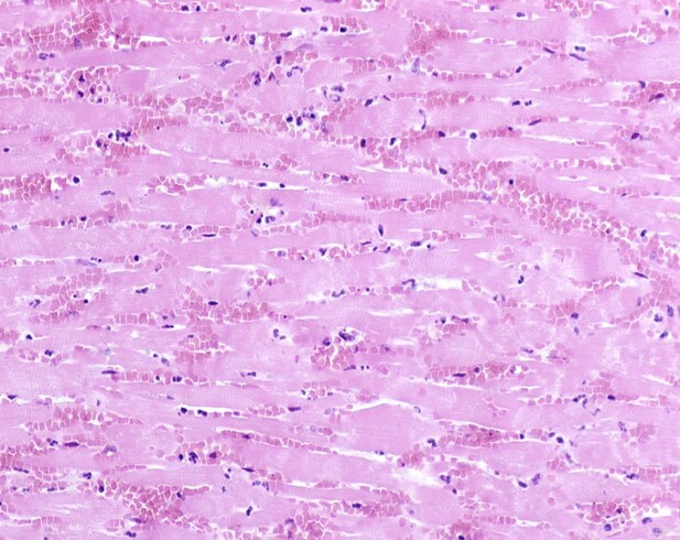 Hypertrophied cardiac myocytes + enlarged nuclei