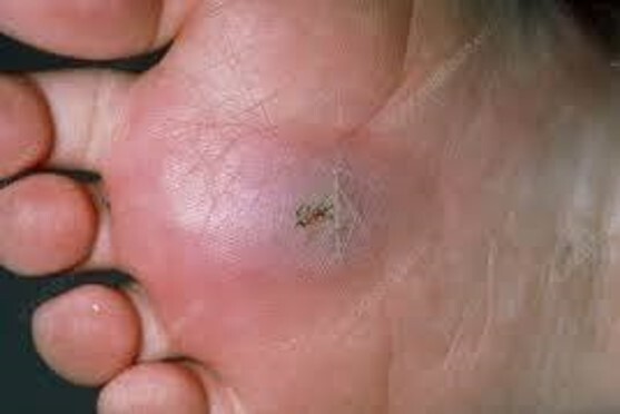 Old man who went gardening bare-foot. Some glass pieces went into his foot, but he has no pain. He says this happened quite a while ago. He came to you because he said it was infected and inflamed. You take the biopsy. Could be a diabetic ulcer, you cut it out – it doesn’t heal all the way properly.