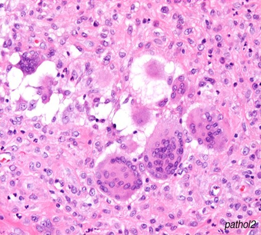 Giant cells have central nuclei; foreign bodies are seen in crystalline deposits surrounded by epithelioid macrophages. Langerhans giant cells