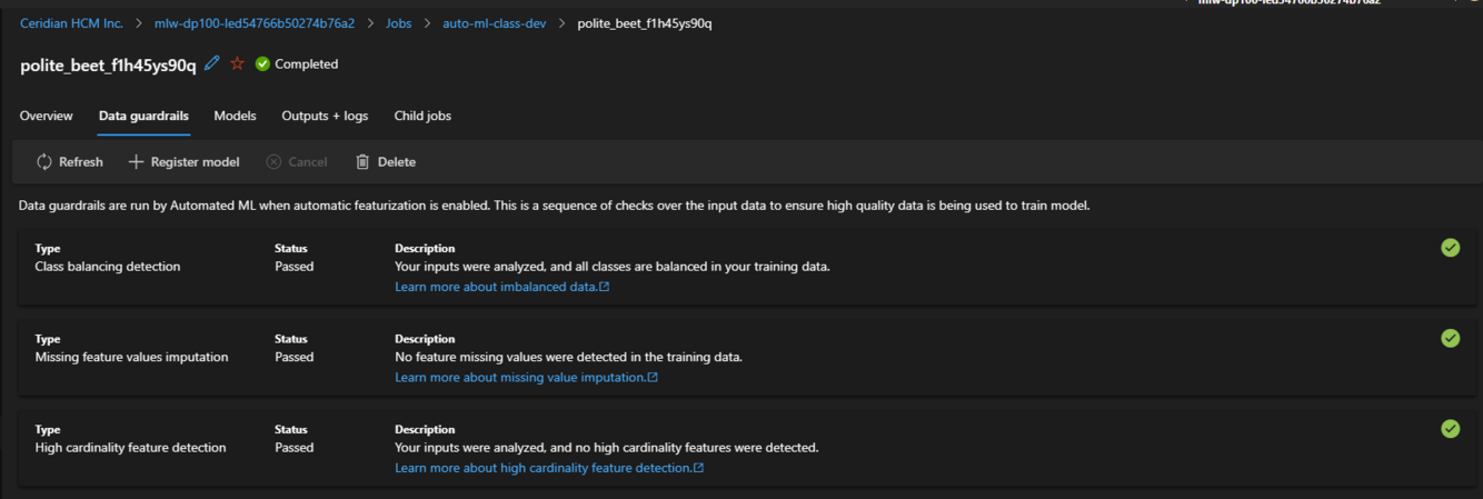 Job Details > Data Guardrails tab. A training job has to complete first before you can view what guardrails were applied.