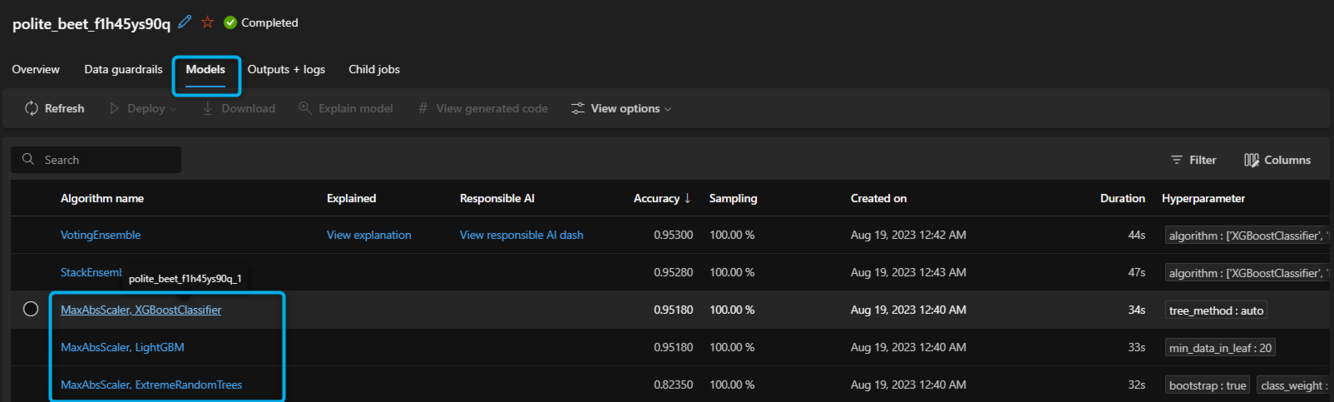Models Tab > Algorithm Name column. If a technique is applied, it is listed in this format: <applied scaling and/or normalization techniques,...>, <algorithm name>