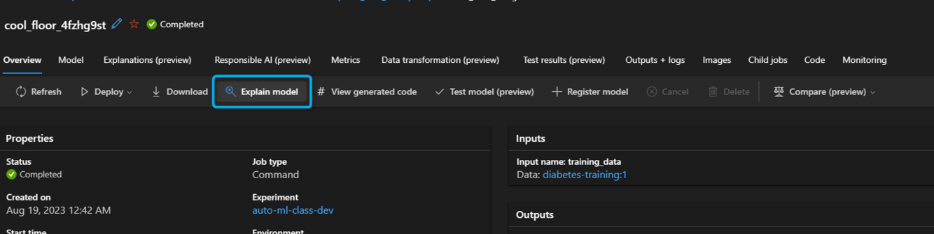You can View Explanation for any trained model by selecting one of the trained models in the Overview tab and select the Explain Model subtab (T/F)