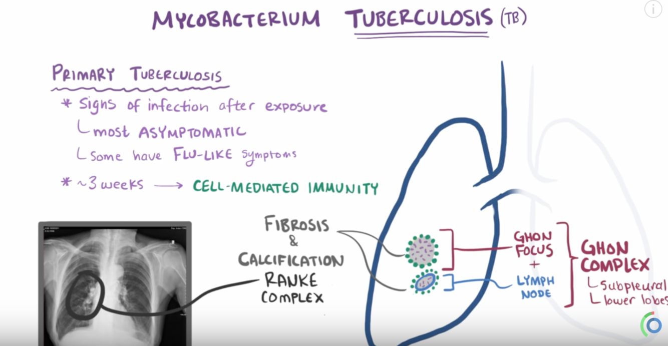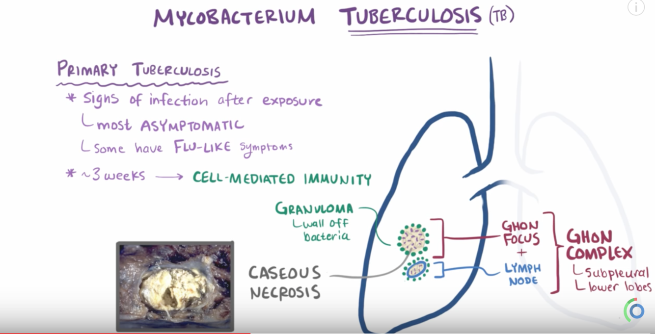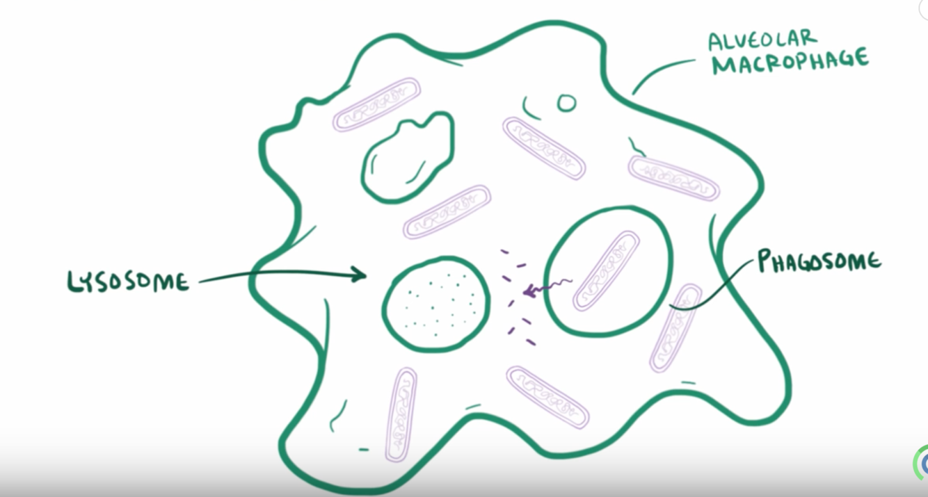 once engulfed by the alveoli macrophages, they produce proteins to inhibit lysozomes from englufing them! this allows them to survuce and they also proliferate!>> PRIMARY INFECTION