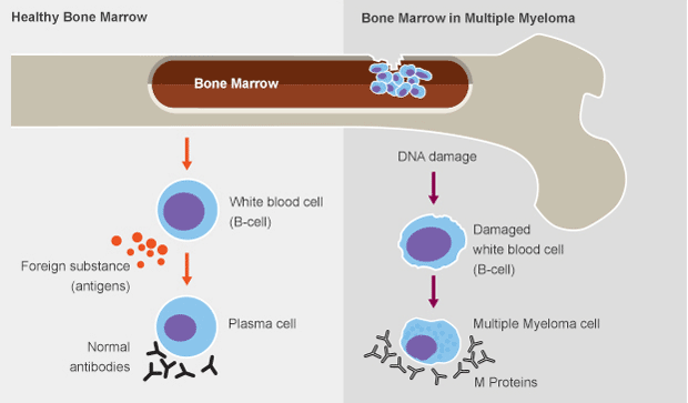 Myeloma is a cancer that affects cells in the bone marrow, called plasma cells. As the cancerous plasma cells fill the bone marrow, you are not able to make enough normal blood cells. This can lead to anaemia, bleeding problems and infections.