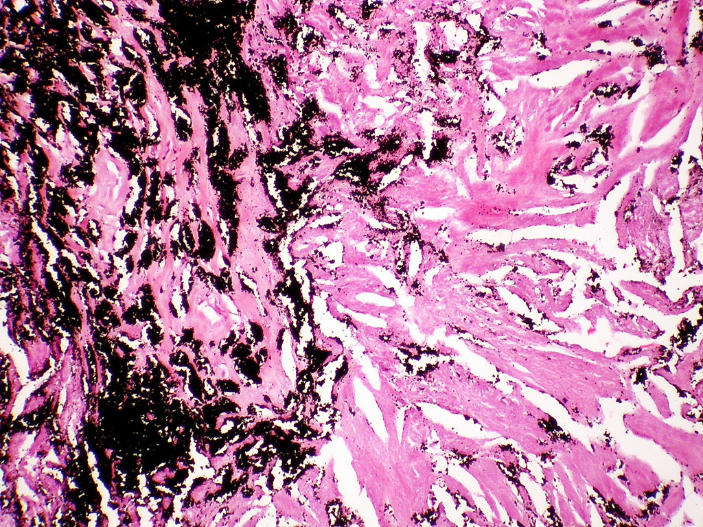 anthracosis: “the asymptomatic, milder type of pneumoconiosis as caused by the accumulation of carbon in the lungs due to repeated exposure to air pollution or inhalation of smoke or coal dust particles”