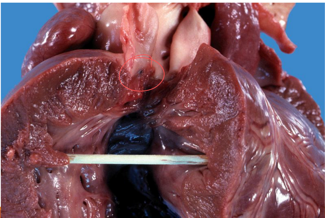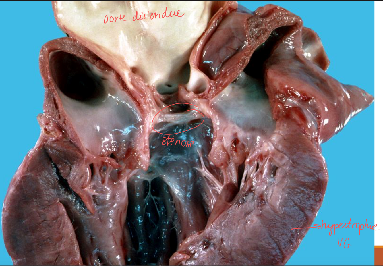 À cause de la turbulence dans l’aorte, on peut aussi avoir des lésions de jet et une dilatation post-sténotique localisée de l’aorte.