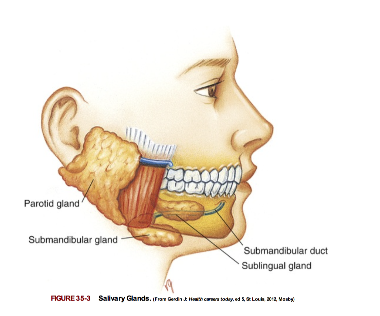 Structures involved: 3 pairs of salivary glands - submandibular, sublingual, parotid glands that collectively secrete ~1L of saliva/day