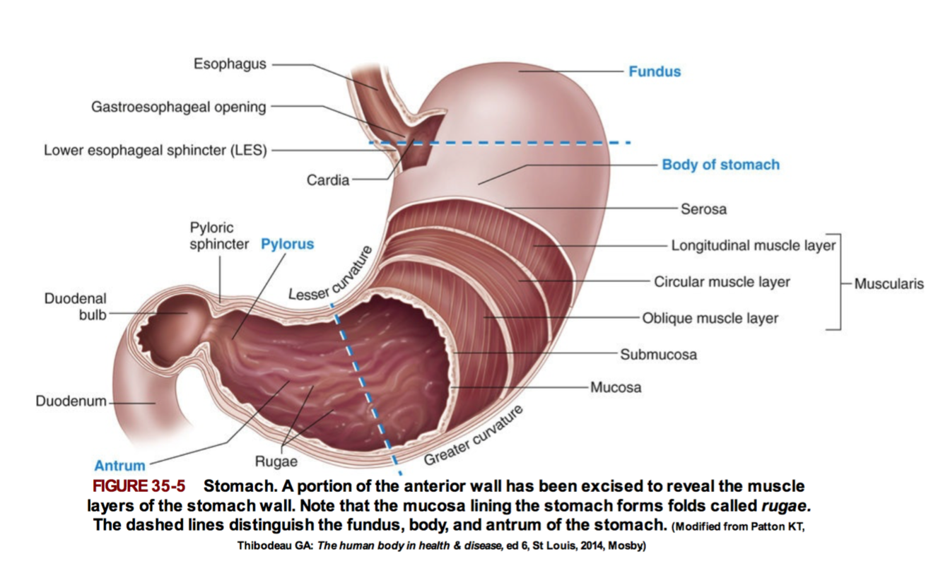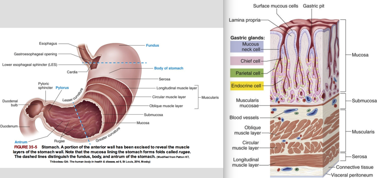 Function: stores food during eating, secretes and mixes food with digestive juices, propels partially digested food (chyme) into duodenum and small intestine