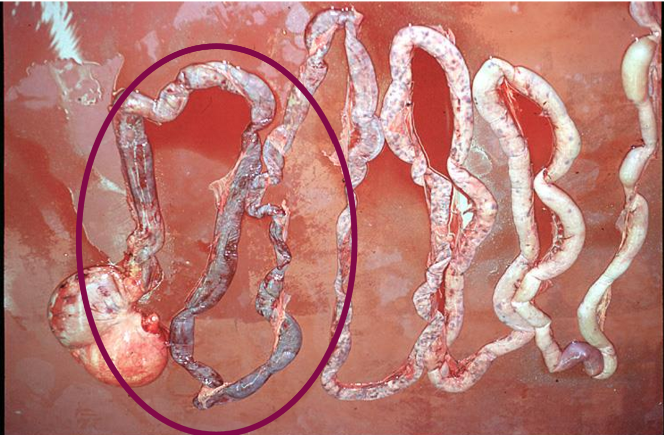 c) Clostridium perfringens/difficile responsable de colite très aigue et toxémie rapidement fatale