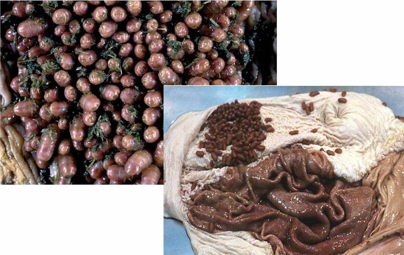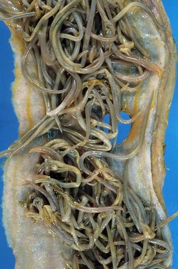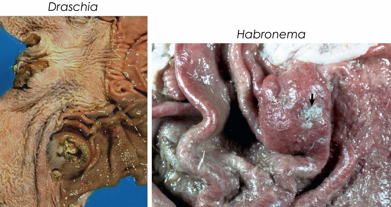 droite: Habronema - reste dans lumière de l’estomac ou s’enfouit dans glande gastrique