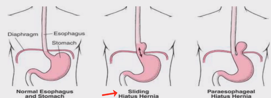 Sliding/axial (95% of cases) this is a bell shaped protrusion of stomach