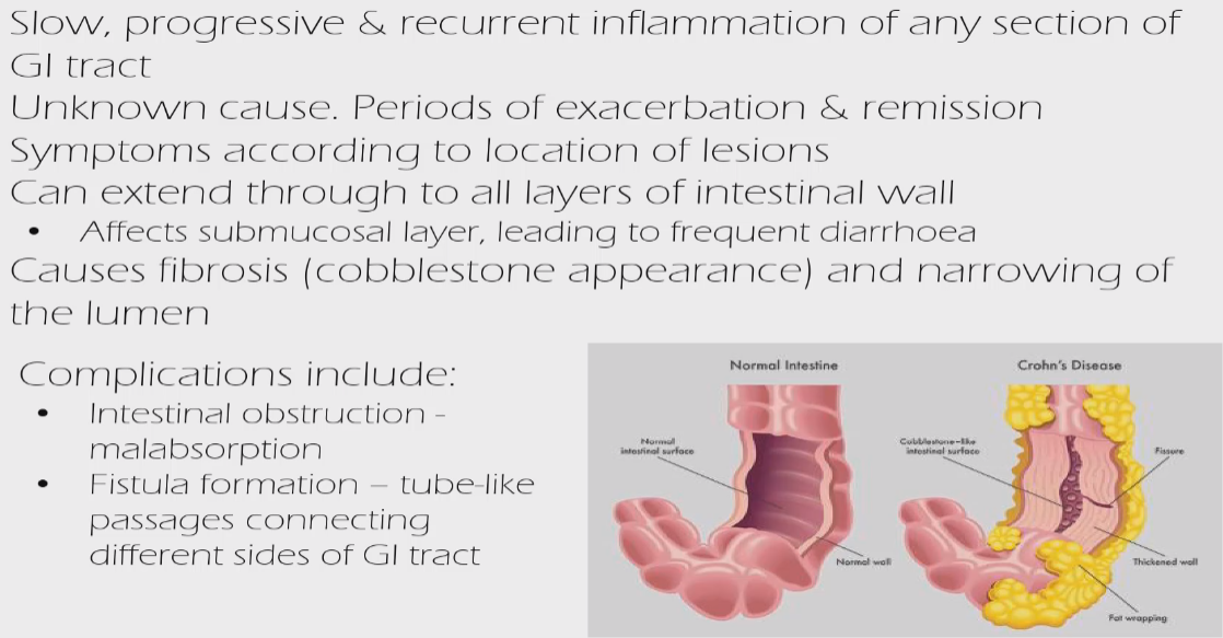 This is slow, progressive & recurrent inflammation of any section of the GI tract (most commonly in the small intestine)