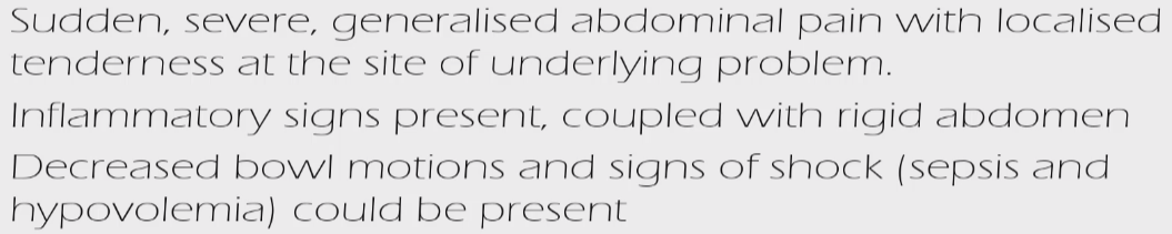 Accompanied with emesis (vomiting), pain, in severe cases, haemorrhage & ulceration