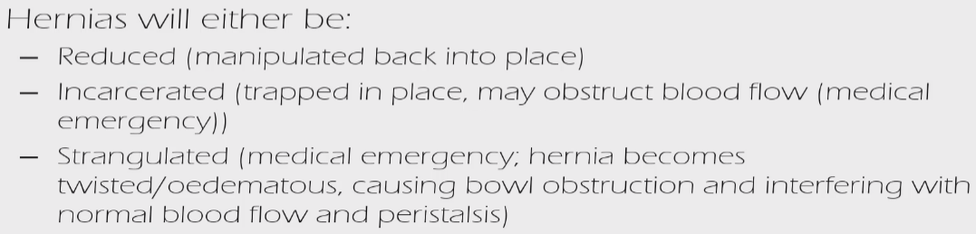 An inguinal hernia - is the most common and is where the portion of the intestine protrudes into the inguinal cavity