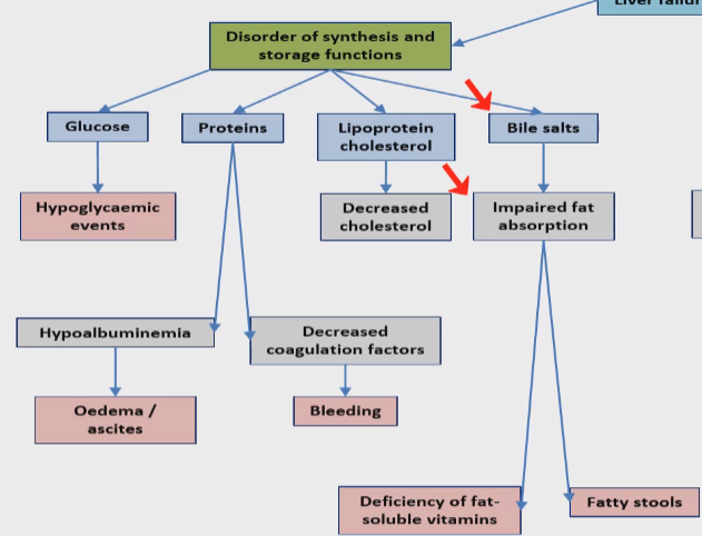 If liver faliure occurs it can affect the amount of B12 vitamin stored. This is essential for the make up of blood, leading to oedema and acites. It can also affect the clotting factors (this is a disorder of synthesis and storage)