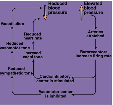 ie. If the BP is increased, the arteries stretch and this is detected by the baroreceptors. They activate the cardio-inhibitory center and inhibit the vasomotor center