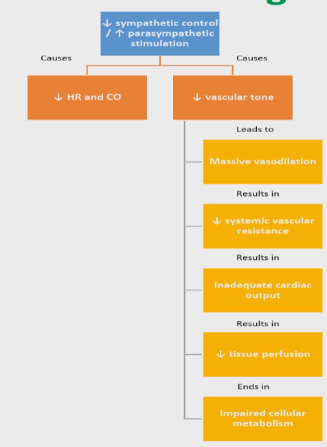 This causes an increase in nitric oxide production which is a strong vasodilator it also causes smooth muscle in the bronchioles to constrict, while causing vascular smooth muscle to relax. This increases permeability of the vessels resulting in more oedema in the pulmonary system and reduced preload to the heart affecting MAP