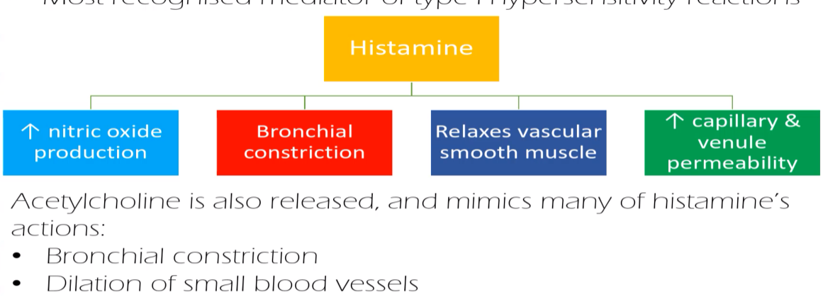 In the primary stage it causes vasodilation, vascular leakage, smooth muscle contraction (in the broncus)